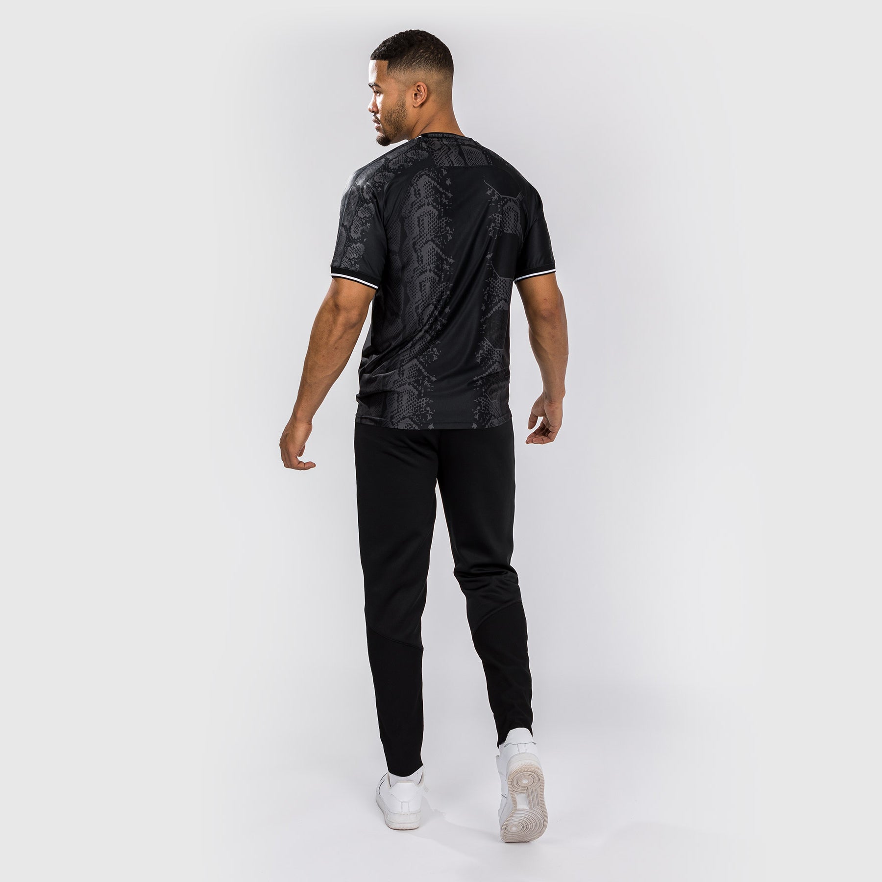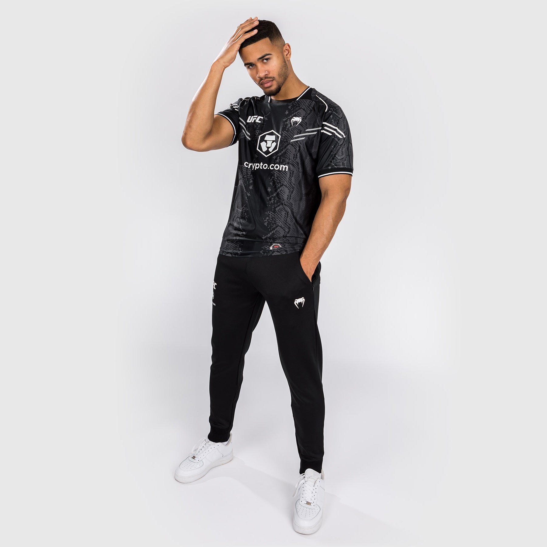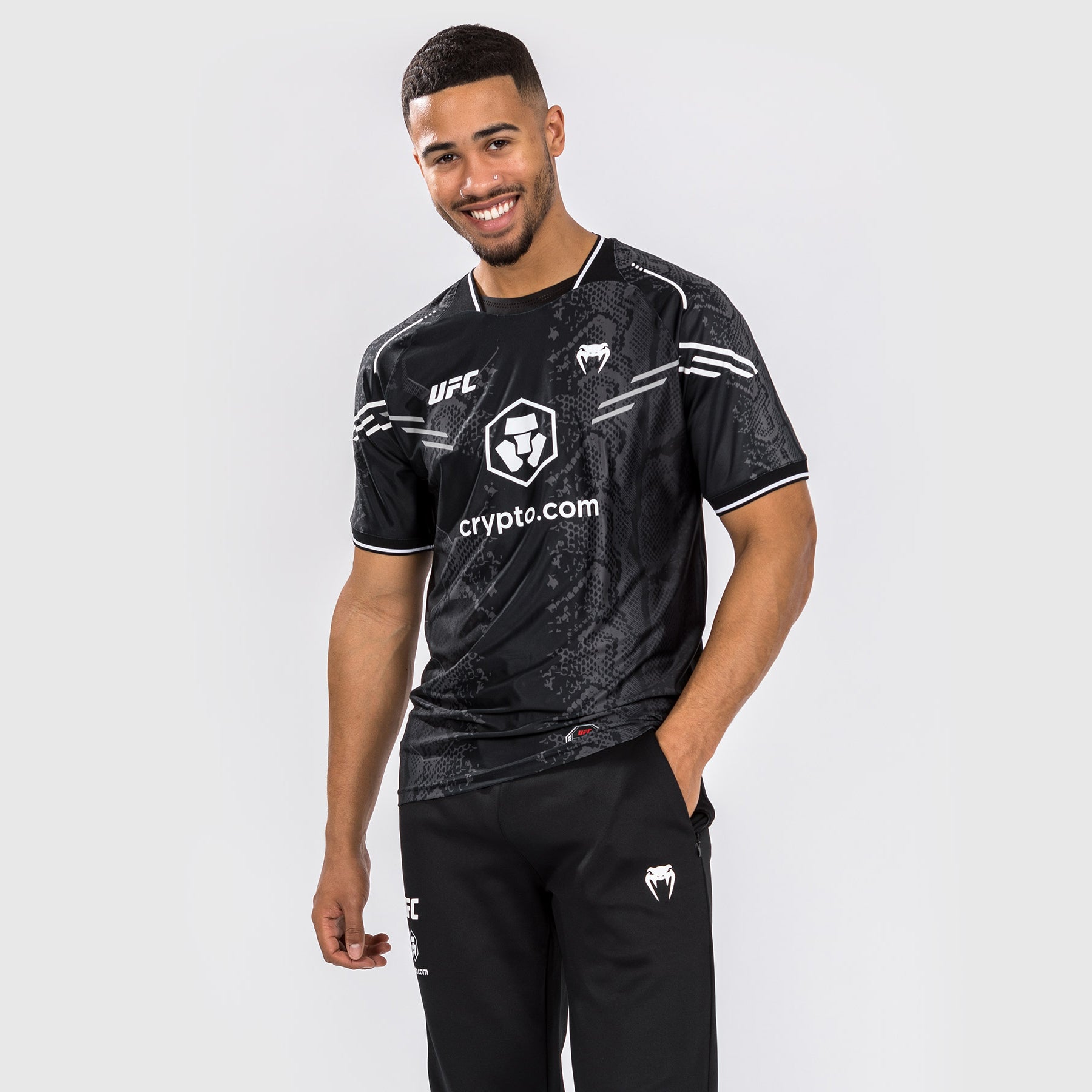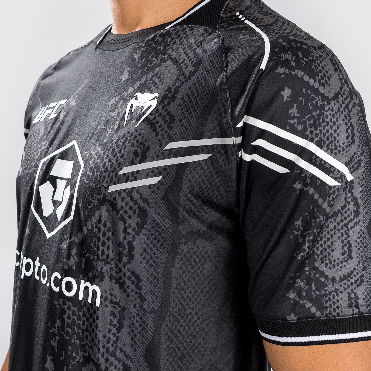 El atrevido diseño, con gráficos sublimados de piel de serpiente y detalles del logotipo en blanco, es un guiño a la experiencia cargada de adrenalina que supone pisar el octágono.