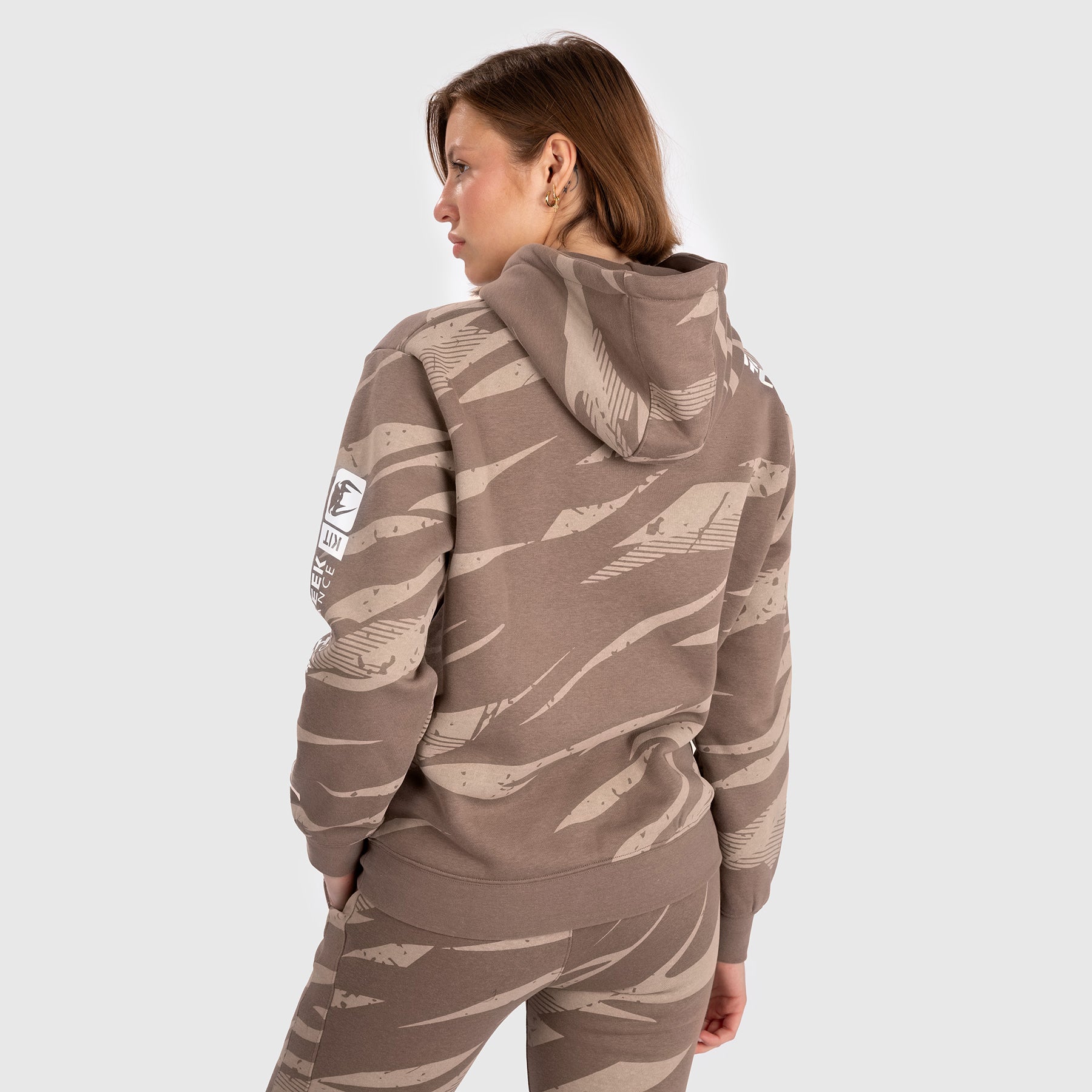 La sudadera con capucha de la Semana de la Pelea UFC Adrenaline by Venum en Desert Camo presenta detalles de logotipo de Venum y UFC en blanco en el pecho, hombro y a lo largo de toda la longitud del brazo izquierdo.