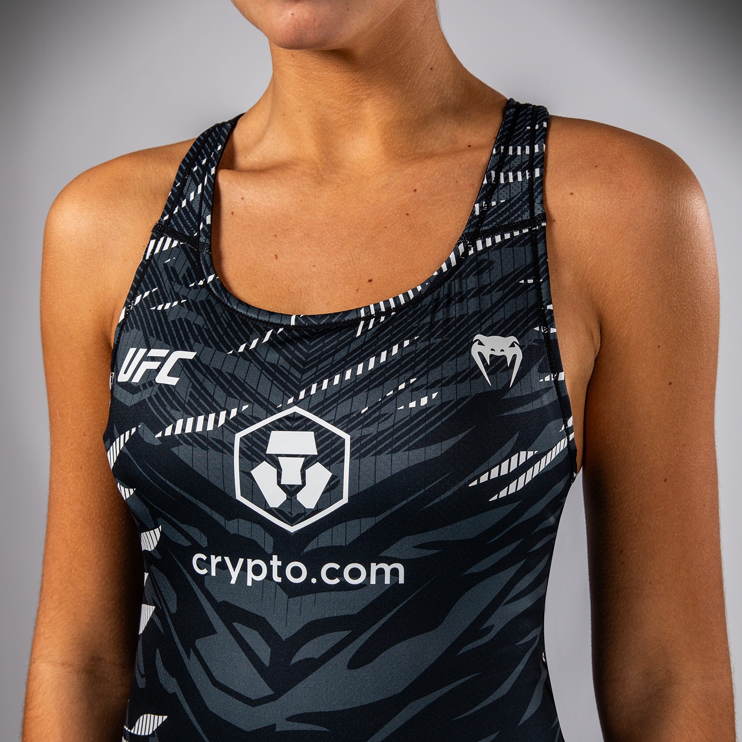 El Tank Fitted de Mujeres UFC Fusion de Venum con sujetador incorporado es adecuado para cardio, levantamiento y sparring. La banda elástica es de soporte, mientras que el corte de espalda racer asegura libertad de movimiento.