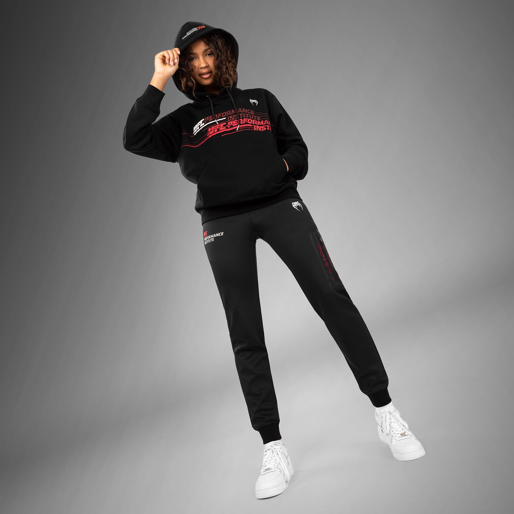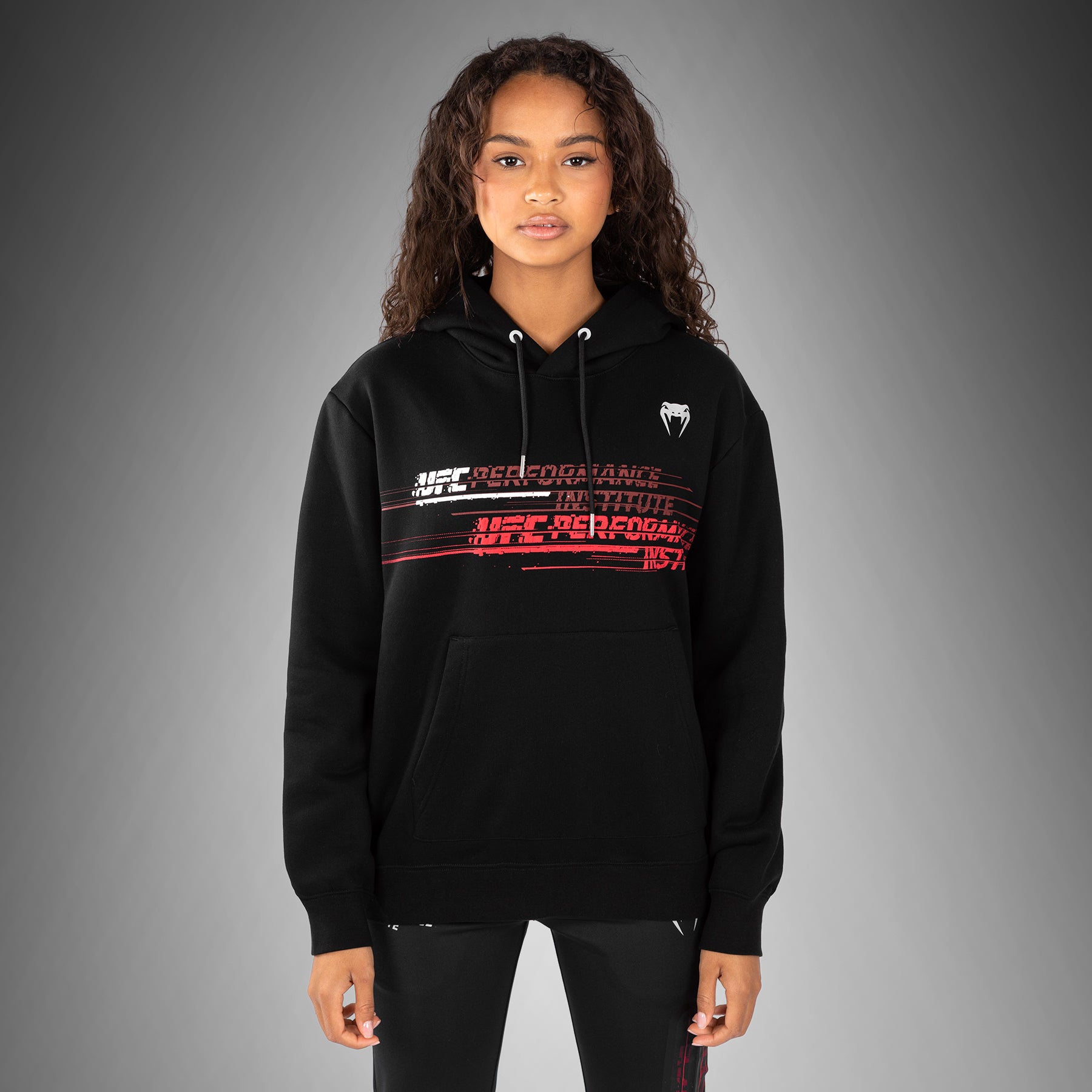 La sudadera negra presenta el dinámico diseño gráfico rojo y blanco de la colección, además de los logotipos del UFC Performance Institute y Venum en el pecho. En la parte trasera de la capucha hay un parche del UFC Performance Institute.