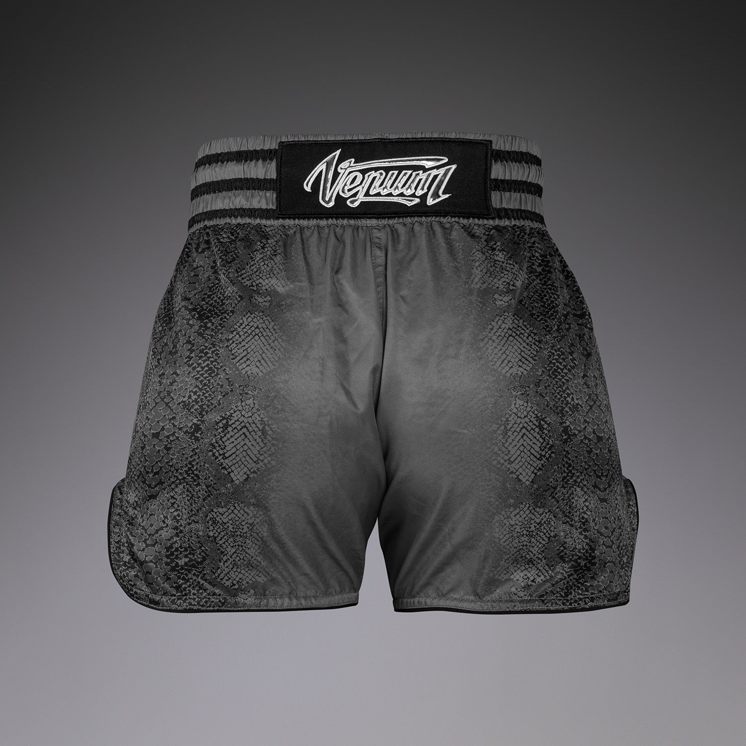 La combinación de colores Gris Oscuro y los detalles metálicos elevan un estampado clásico de piel de serpiente para crear unos pantalones cortos únicos que combinan perfectamente con los guantes de boxeo y el sujetador deportivo de la misma colección.