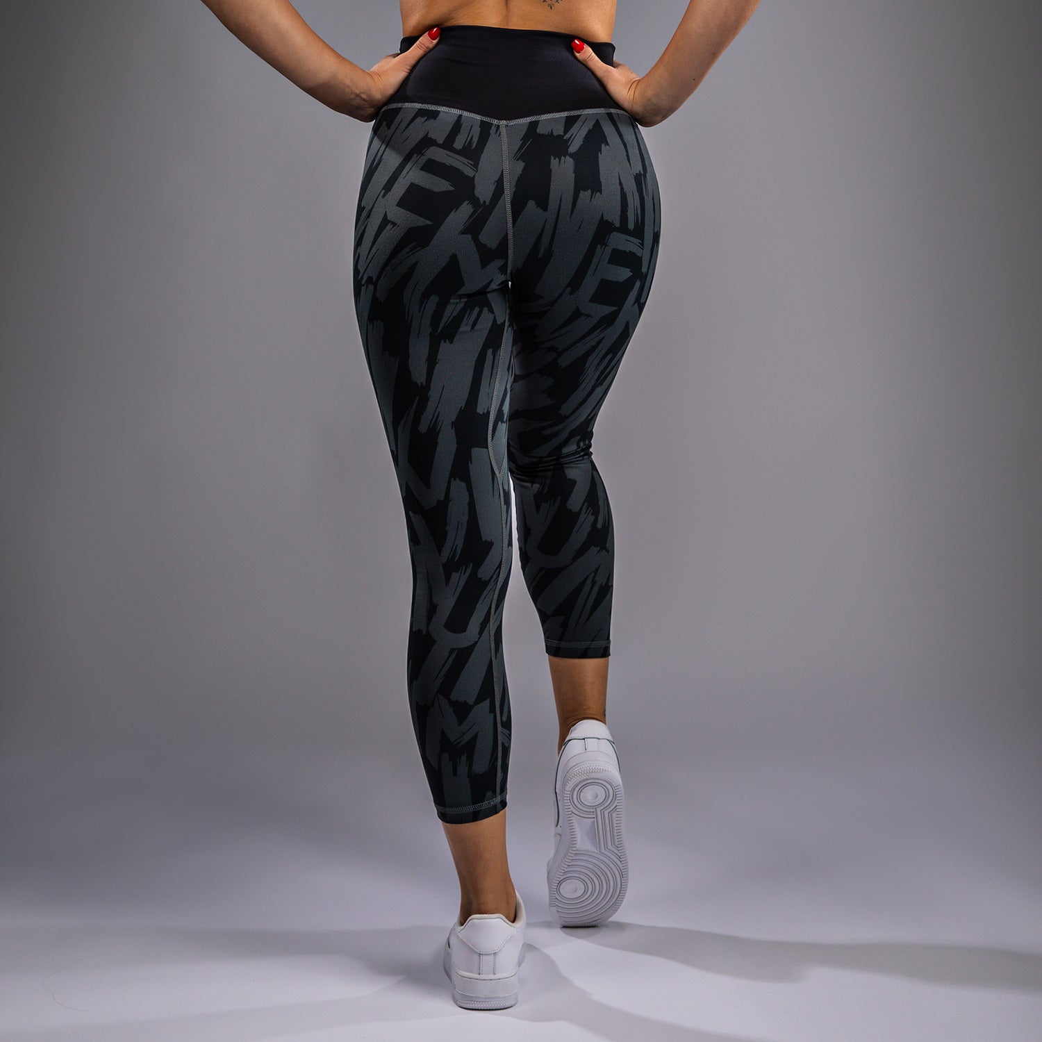 Los leggings Venum Graffiti 7/8 para mujer en Urban Charcoal son de cintura alta y a prueba de sentadillas, y presentan un graffiti tonal estampado y logo blanco de Venum en blanco en la cadera. La tela es ligeramente compresiva pero liviana para una sensación suave y apenas visible. El largo ⅞ llega a la parte inferior de la pantorrilla si mides más de 5'4".