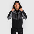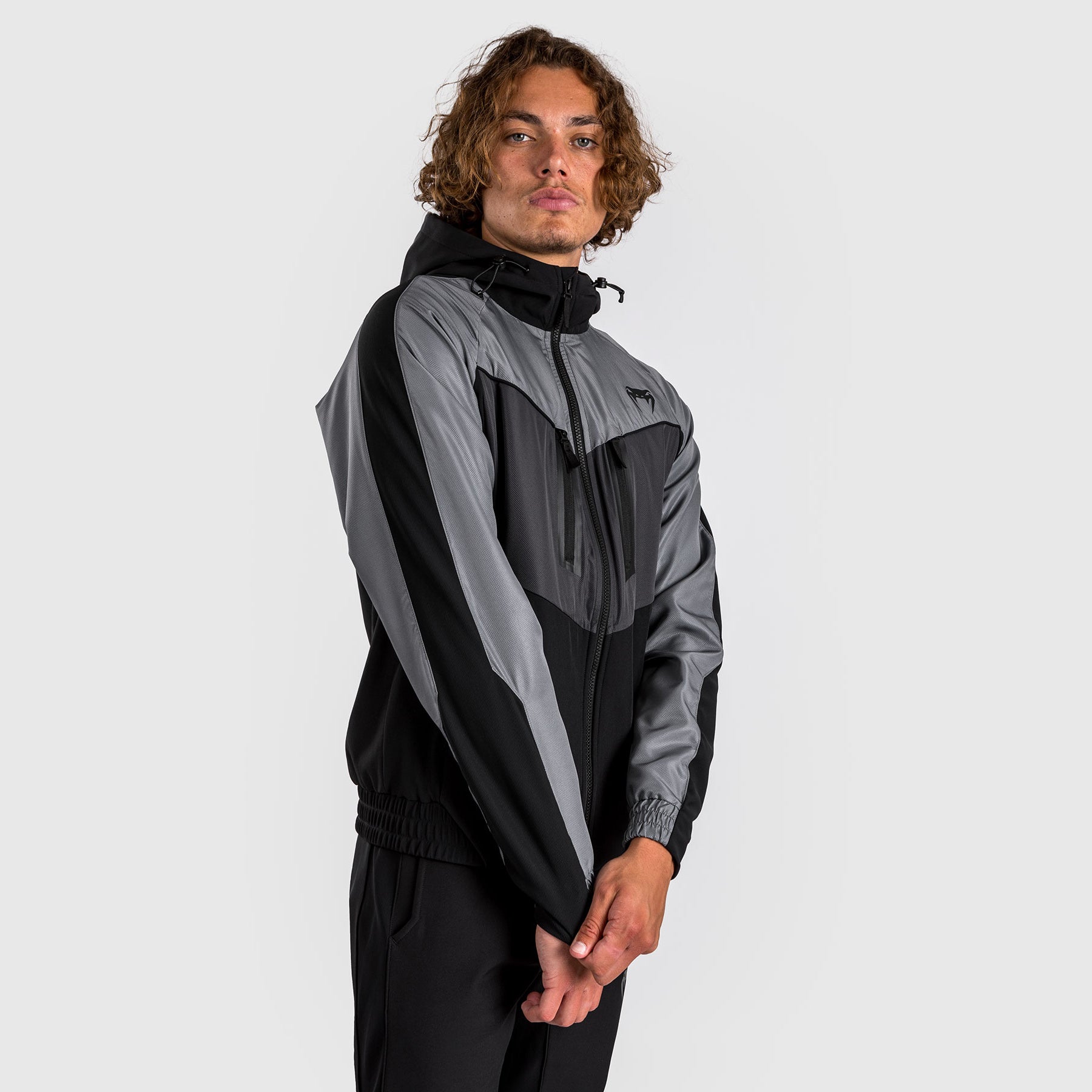 Las cremalleras negras y el logotipo Venum negro en el pecho contrastan con los tonos grises de la sudadera con capucha para un llamativo acabado deportivo.