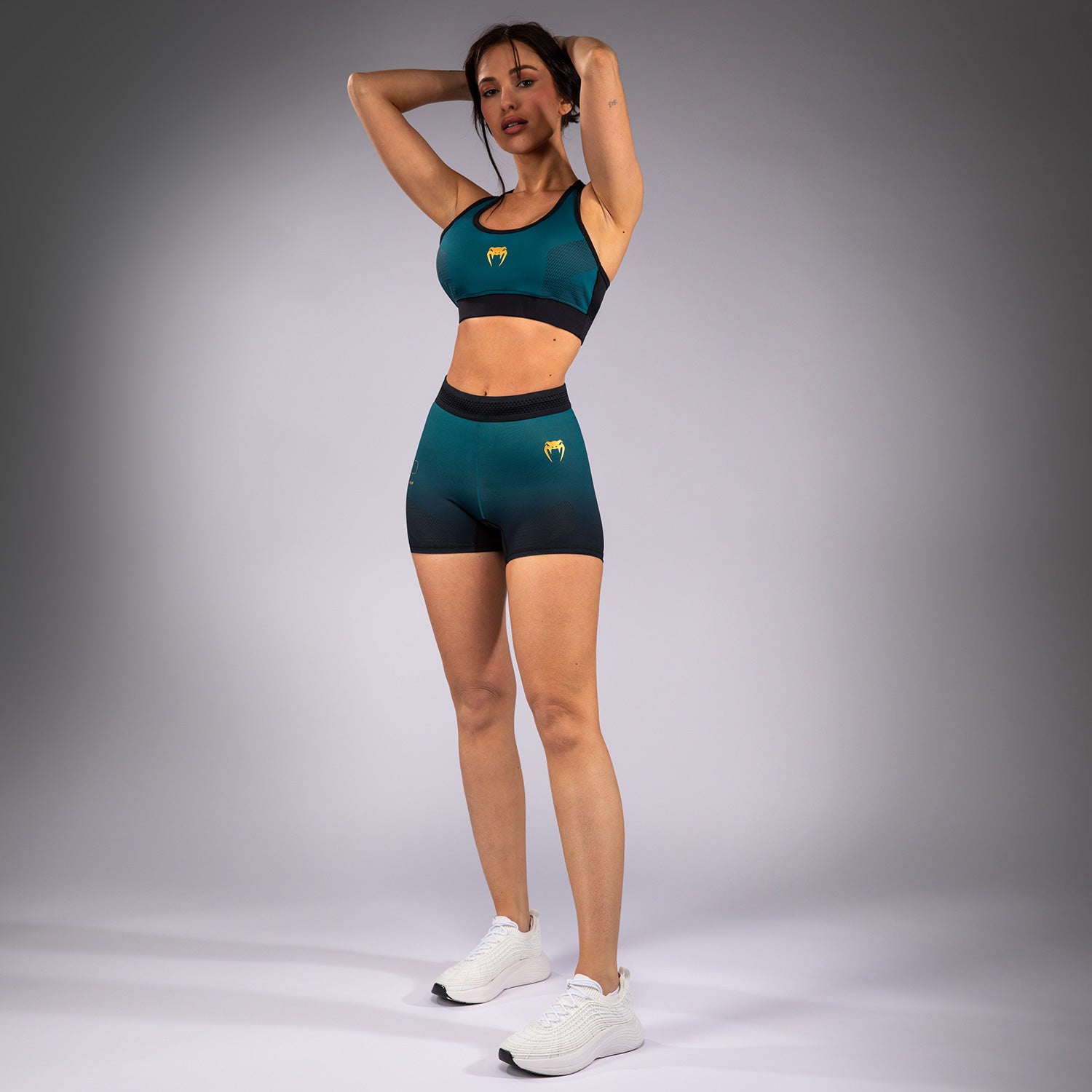 Este favorecedor pantalón corto de entrenamiento para mujer ha sido diseñado con un sutil efecto ombre acentuado por dinámicas líneas de color y toques dorados.